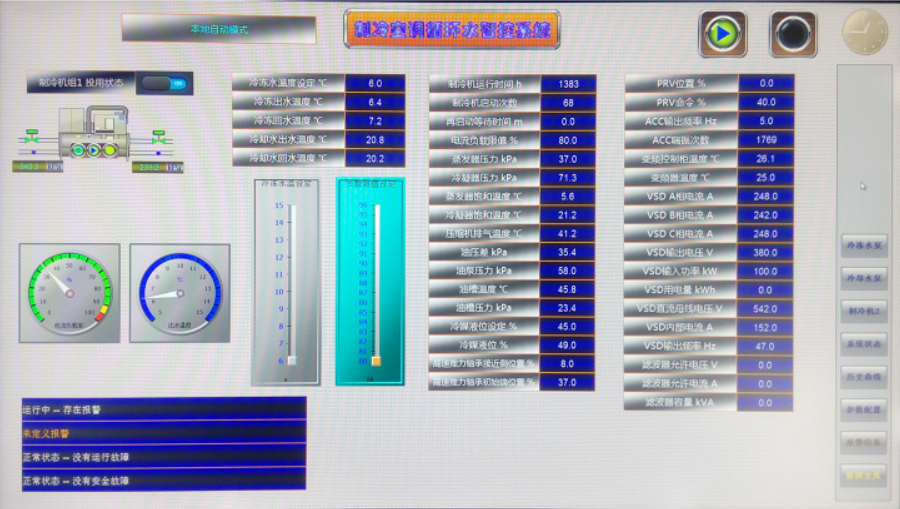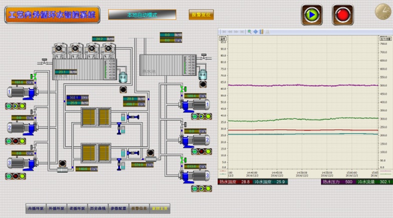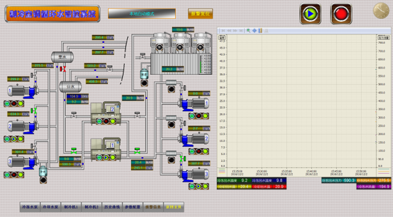 此項目采用西門子S7-300 PLC控制系統(tǒng)和分布式IO控制站、WinCC上位機監(jiān)控采集系統(tǒng),充分運用優(yōu)化的邏輯控制流程,并通過數(shù)字控制算法,調節(jié)各變頻泵、變頻冷水機組、電控調節(jié)閥,保證機組、水泵、冷卻塔投用及切換充分合理優(yōu)化,同時又能快速穩(wěn)定地響應全部試驗間、生產(chǎn)車間在全范圍內的負荷切換和波動,保持環(huán)境空調冷水、工藝試驗冷水、燃油冷水的工藝參數(shù)穩(wěn)定。在保證生產(chǎn)試驗要求的基礎上實現(xiàn)經(jīng)濟節(jié)能運行控制。